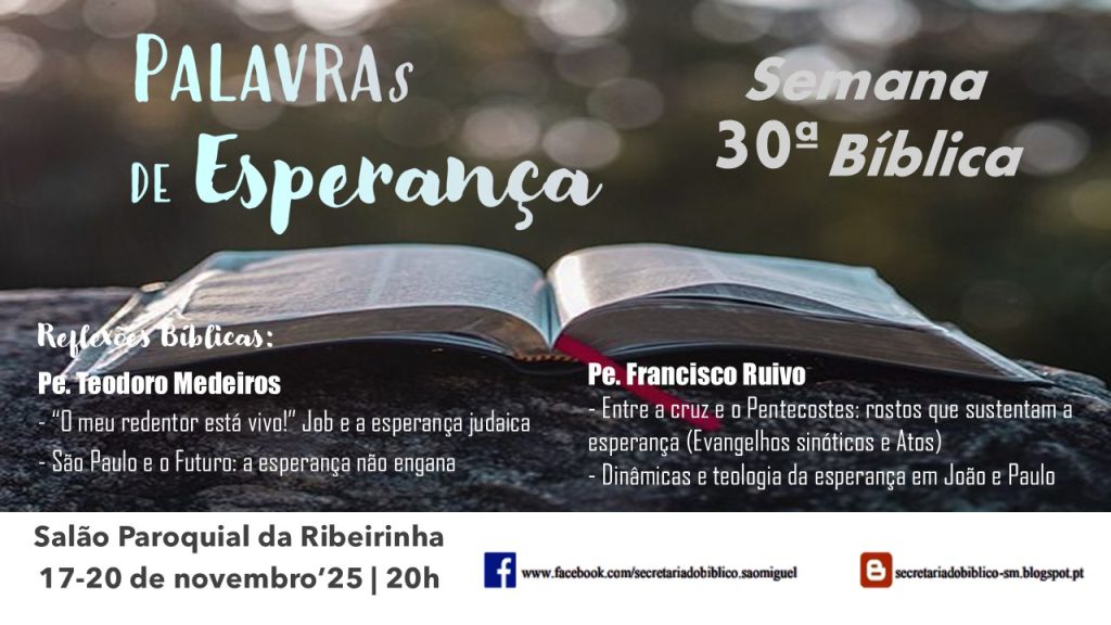 A 30ª Semana Bíblica Diocesana de São Miguel realiza-se de 17 a 20 de novembro, no Salão Paroquial do Santíssimo Salvador do Mundo, na Ribeirinha, ouvidoria da Ribeira Grande. As sessões terão lugar diariamente, às 20h00, e serão transmitidas em direto através da página do Facebook do Secretariado Bíblico de São Miguel, informa uma nota da organização que desafia todos os participantes que estejam em São Miguel a estar presencialmente.