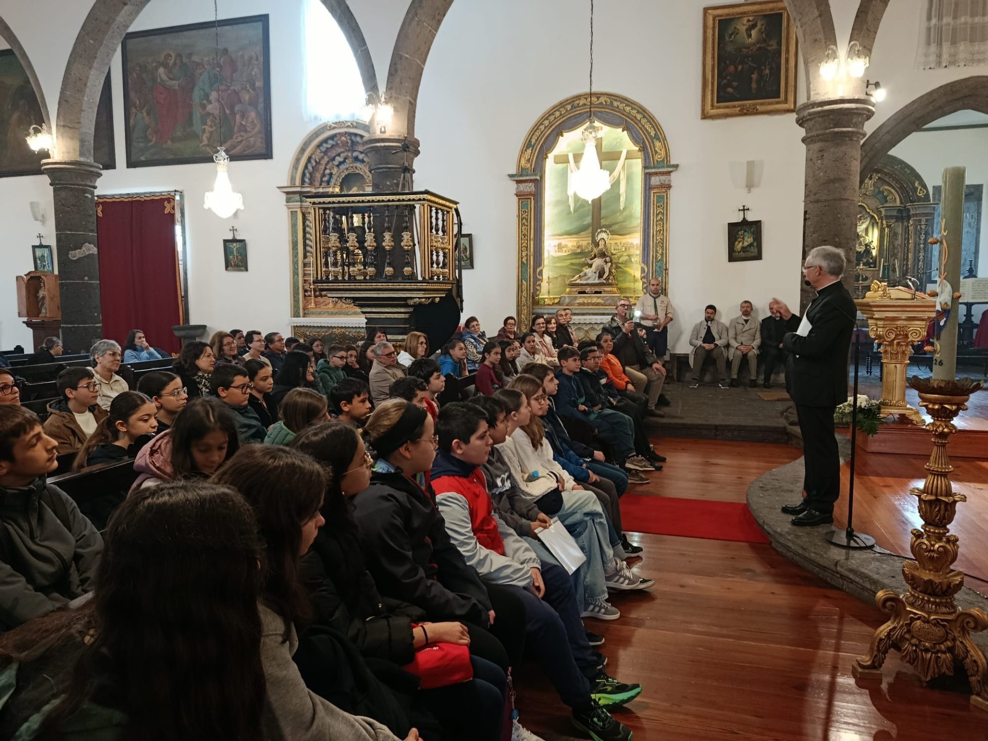 O primeiro momento, vivido com as crianças do sexto ano da catequese, trouxe um tom particularmente intimista ao arranque da visita. Na simplicidade do encontro, entre olhares curiosos e alguma timidez própria da idade, D. Armando Esteves Domingues procurou criar um ambiente de proximidade, falando de forma direta e acessível, quase como quem conversa em família. Mais do que um discurso formal, foi um diálogo feito de gestos, perguntas e pequenas histórias, onde a atenção das crianças se manteve presa a cada palavra.