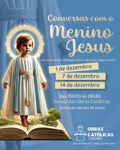 Aos domingos, nos dias 1, 7 e 14 de dezembro, realizam-se as “Conversas com o Menino Jesus”, orientadas para a Catequese da Infância, do 1.º ao 5.º catecismo. Haverá contos, jogos, atividades manuais e explicações sobre o presépio e o sentido do Natal.