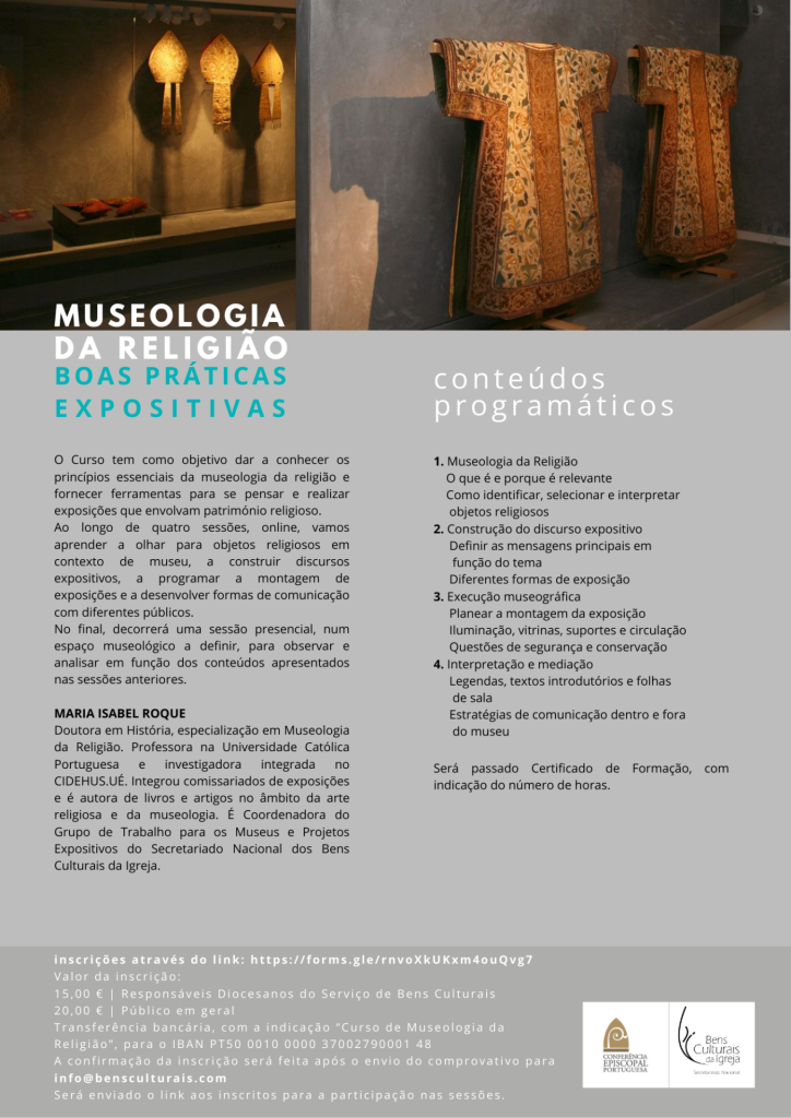 O Secretariado Nacional dos Bens Culturais da Igreja realiza, no próximo mês de fevereiro, um curso online dedicado ao tema “Museologia da Religião | Boas Práticas Expositivas”, ministrado por Maria Isabel Roque, professora na Universidade Católica Portuguesa e especialista na área da Museologia da Religião, informa uma nota enviada ao Sítio Igreja Açores.